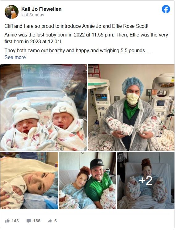 نشرت الأم السعيدة كالي جو عبر حسابها على فيس بوك صوراً لأطفالها وزوجها، وأعربت عن فخرها بأنّ طفلتها “آني جو” كانت آخر طفلة ولدت في 2022، وطقلتها “إيفي روز” كانت أول طفلة تولد في 2023″. ووفقاً للصحيفة الأمريكية، فإنّ الطفلتين بصحة جيدة وتزن كل واحدة منهما 2.5 كلغ.