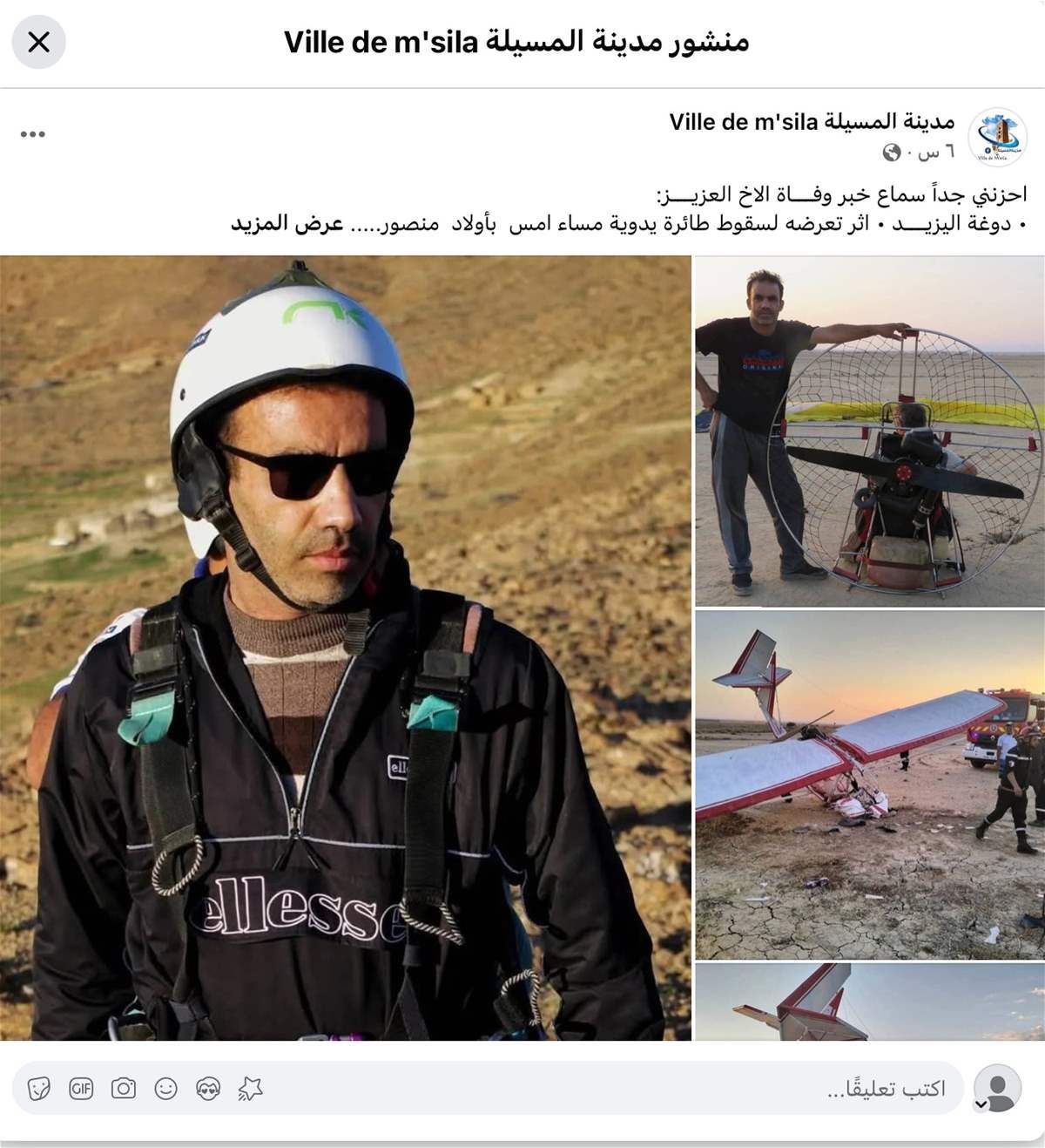 وفي بيان رسمي، أوضحت مصالح الحماية المدنية أن وحداتها تدخلت بعد بلاغ عن سقوط طائرة صغيرة مصنوعة يدويًا في منطقة أولاد منصور، مشيرة إلى أن الضحية، البالغ من العمر نحو 50 عامًا، نُقل على الفور إلى مستشفى المسيلة، حيث لفظ أنفاسه الأخيرة متأثرًا بإصاباته.
