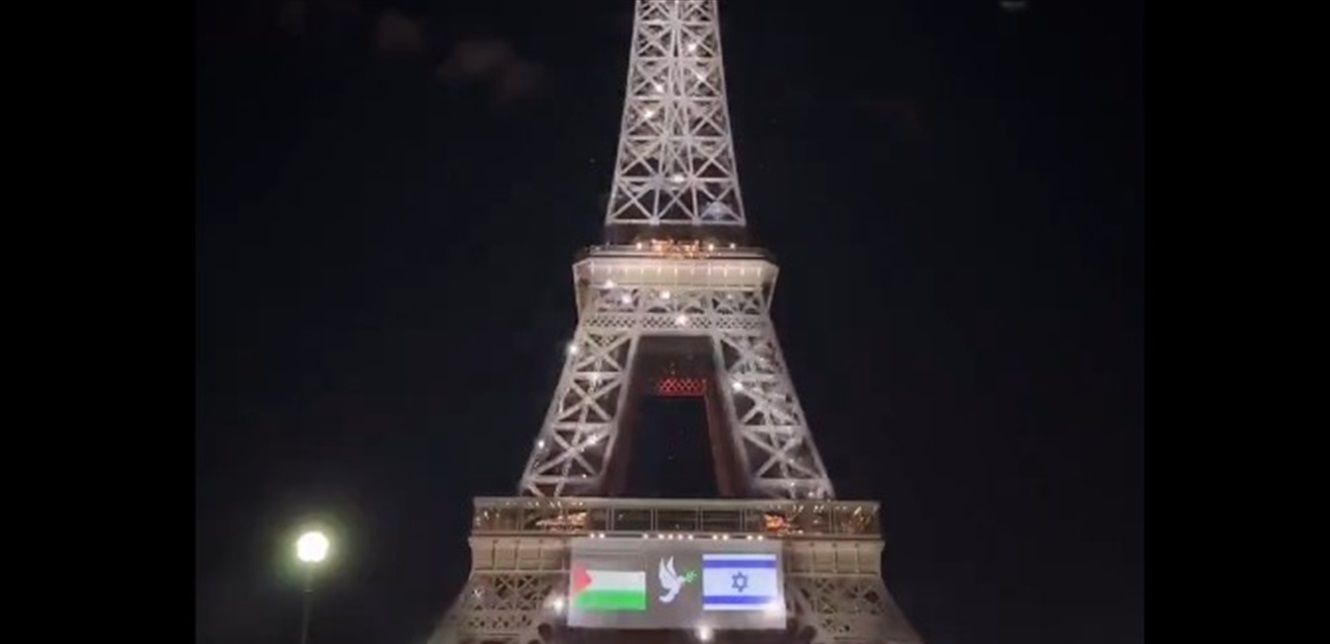 دعما للسلام، أضاء برج إيفل في باريس، مساء أمس الأحد أنواره باللون الأبيض، فيما وعرضت شاشة مثبتة عليه علما فلسطين وإسرائيل، تفصل بينهما حمامة ترمز للسلام، على النصب التذكاري.
