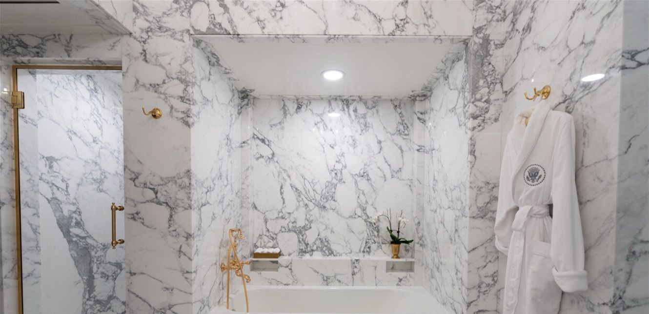ترامب نشر صور التجديد عبر حساباته على مواقع التواصل الاجتماعي، مظهرًا حمّامًا بلمسات فندقية فخمة — تجهيزات ذهبية، رأس دش وصنابير مطلية بالذهب، وأرضية من الرخام الأبيض المخطط بالرمادي.