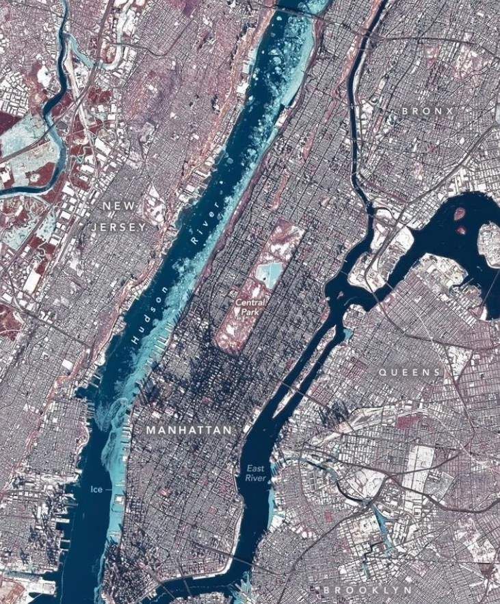 وبحسب ما نقلت صحيفة "ديلي ميل"، التقط القمر الصناعي لاندسات 8 صورة جوية لمدينة نيويورك ونيوجيرسي في 28 كانون الثاني الماضي، عندما وصلت درجات الحرارة إلى 23 فهرنهايت فقط، أي ما يعادل 5 درجات مئوية تحت الصفر.