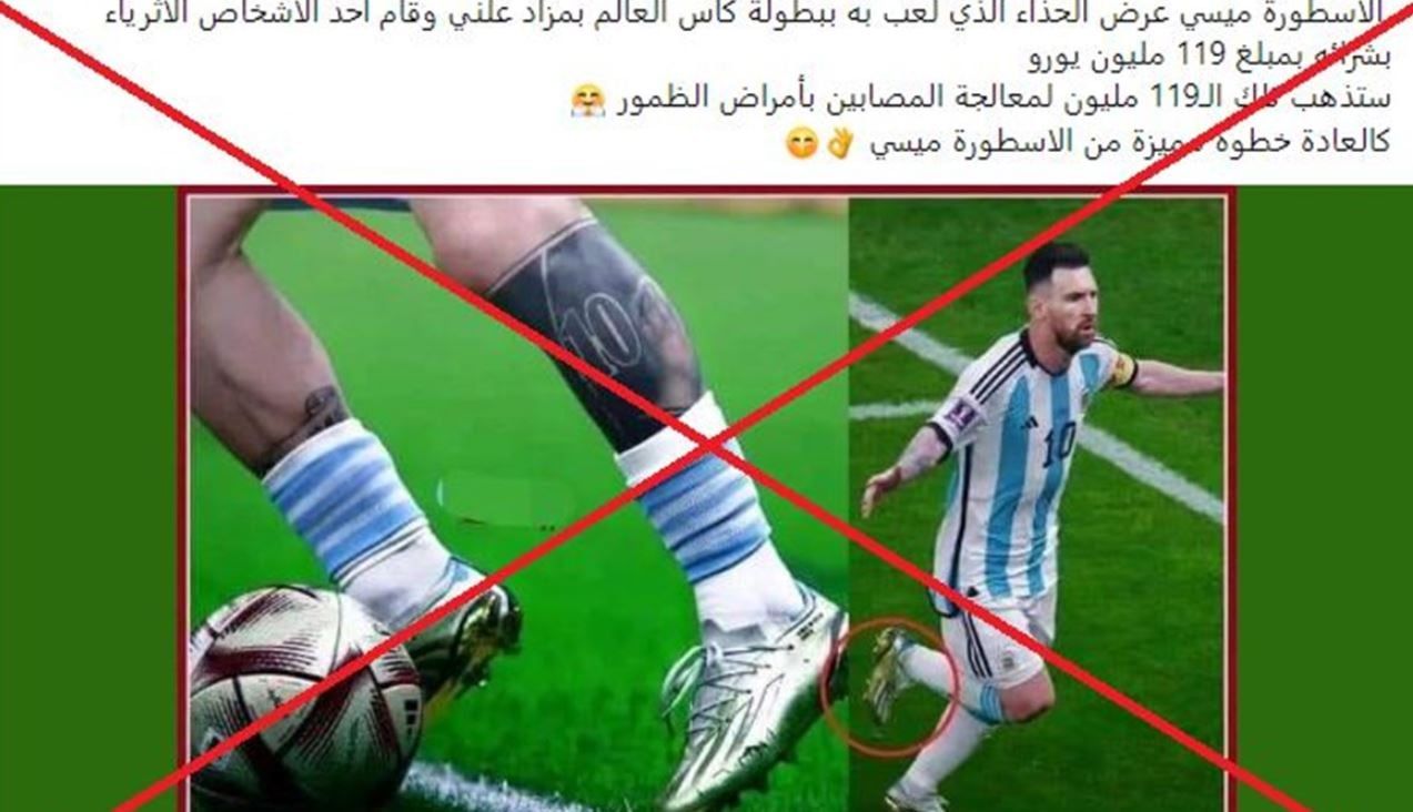 زعم منشور متداول عبر وسائل التواصل الاجتماعي، أن “اللاعب الأرجنتيني ليونيل ميسي عرض الحذاء الذي لعب به خلال بطولة كأس العالم في قطر بمزاد علني، واشتراه أحد الأثرياء بمبلغ 119 مليون يورو”.