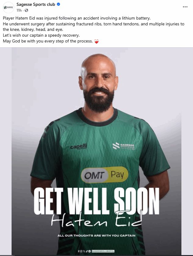تعرّض قائد فريق الحكمة حاتم عيد لإصابات بليغة في جسده جرّاء انفجار بطارية ليثيوم إلى جانبه، وفق ما أعلن النادي.