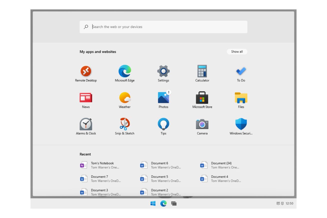 ويتركز الزر ابدأ الآن في شريط المهام مع قائمة ابدأ التي تعمل بصفتها مشغل (لانشر)، ولا يحتوي على Live Tiles الموجودة ضمن ويندوز 10، وبدلاً من ذلك، هناك قائمة بالتطبيقات والمستندات الحديثة.