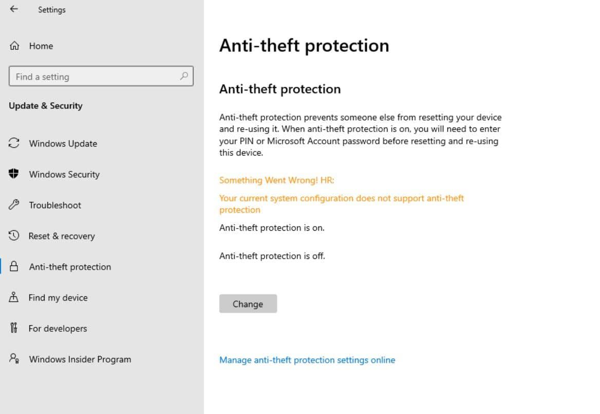 وتصف مايكروسوفت الميزة في تطبيق الإعدادات: الحماية ضد السرقة تمنع أي شخص آخر من إعادة ضبط جهازك وإعادة استخدامه، وعند تشغيل الحماية ضد السرقة، تحتاج إلى إدخال رقم التعريف الشخصي أو كلمة مرور حساب مايكروسوفت قبل إعادة ضبط هذا الجهاز وإعادة استخدامه.