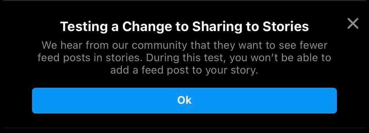 وفي أواخر الأسبوع الماضي، بدأت المنصة بإرسال إشعار إلى مستخدمين محددين يقول: نسمع من مجتمعنا أنهم يريدون مشاهدة مشاركات أقل في القصص، وخلال هذا الاختبار، لن تتمكن من إضافة منشور خلاصتك إلى قصتك.