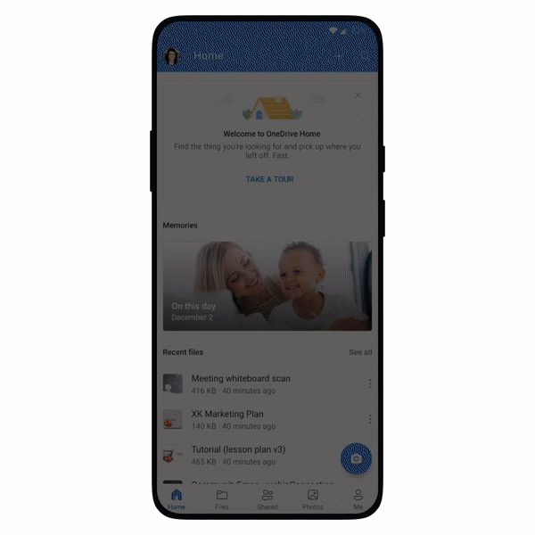 وتتضمن الشاشة الرئيسية الجديدة وصولاً سريعًا إلى الملفات الحديثة والملفات غير المتصلة بالإنترنت وميزة في مثل هذا اليوم On This Day في OneDrive التي تذكرك بصورك القديمة.