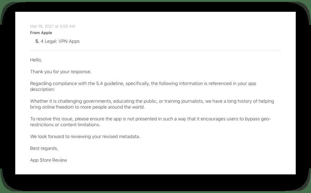 وفي رسالة بريد إلكتروني إلى Proton، طلبت آبل من الشركة ضمان عدم تقديم التطبيق بطريقة تشجع المستخدمين على تجاوز القيود الجغرافية أو قيود المحتوى.
