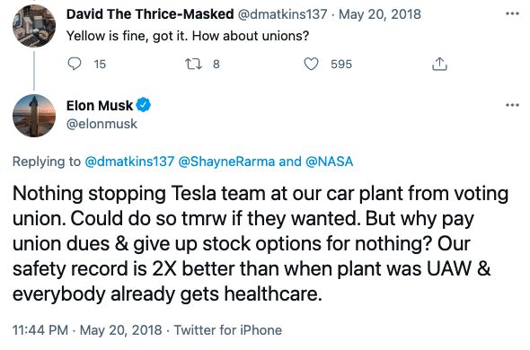وhttps://twitter.com/elonmusk/status/998454539941367808 الرئيس التنفيذي عبر تويتر في عام 2018: لا شيء يمنع فريق تيسلا في مصنع السيارات لدينا من التصويت، ويمكن أن يفعلوا ذلك غدًا إذا أرادوا، لكن لماذا تدفع مستحقات الاتحاد وتتخلى عن خيارات الأسهم مقابل لا شيء.