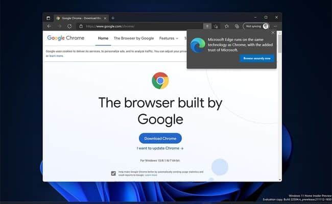 وبدأ كل من ويندوز 10 وويندوز 11 بعرض مطالبات جديدة عندما ينتقل الأشخاص إلى صفحة تنزيل جوجل كروم، في محاولة لثني الناس عن تثبيت متصفح جوجل المنافس.