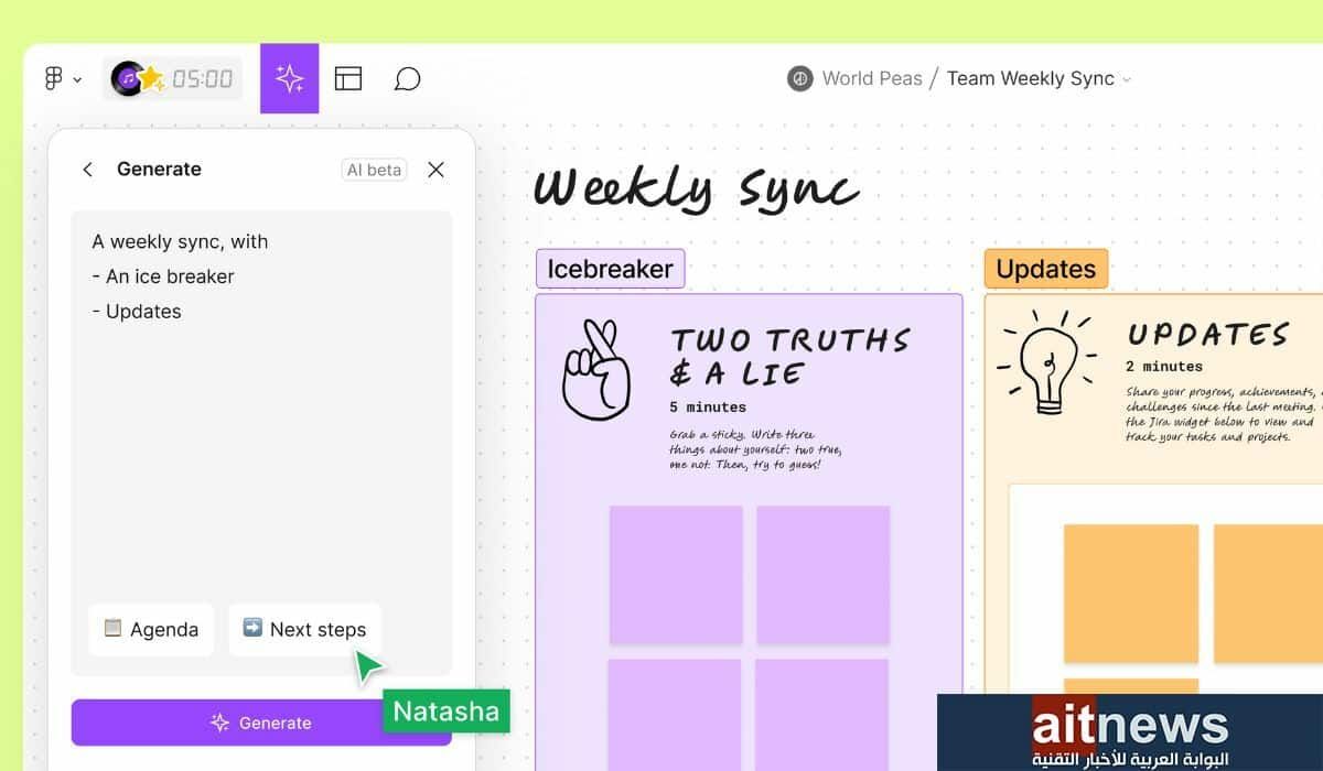 وتتيح مزايا الذكاء الاصطناعي التوليدي الجديدة إمكانية إنشاء قوالب جاهزة للاستخدام لمشاريع التصميم والتخطيط المشتركة، وتتمحور فكرتها حول تقليل وقت الإعداد اللازم لإنشاء مشاريع السبورة البيضاء التعاونية يدويًا من البداية، مما يتيح للمصممين توفير الوقت للتركيز على المهام الملحة.