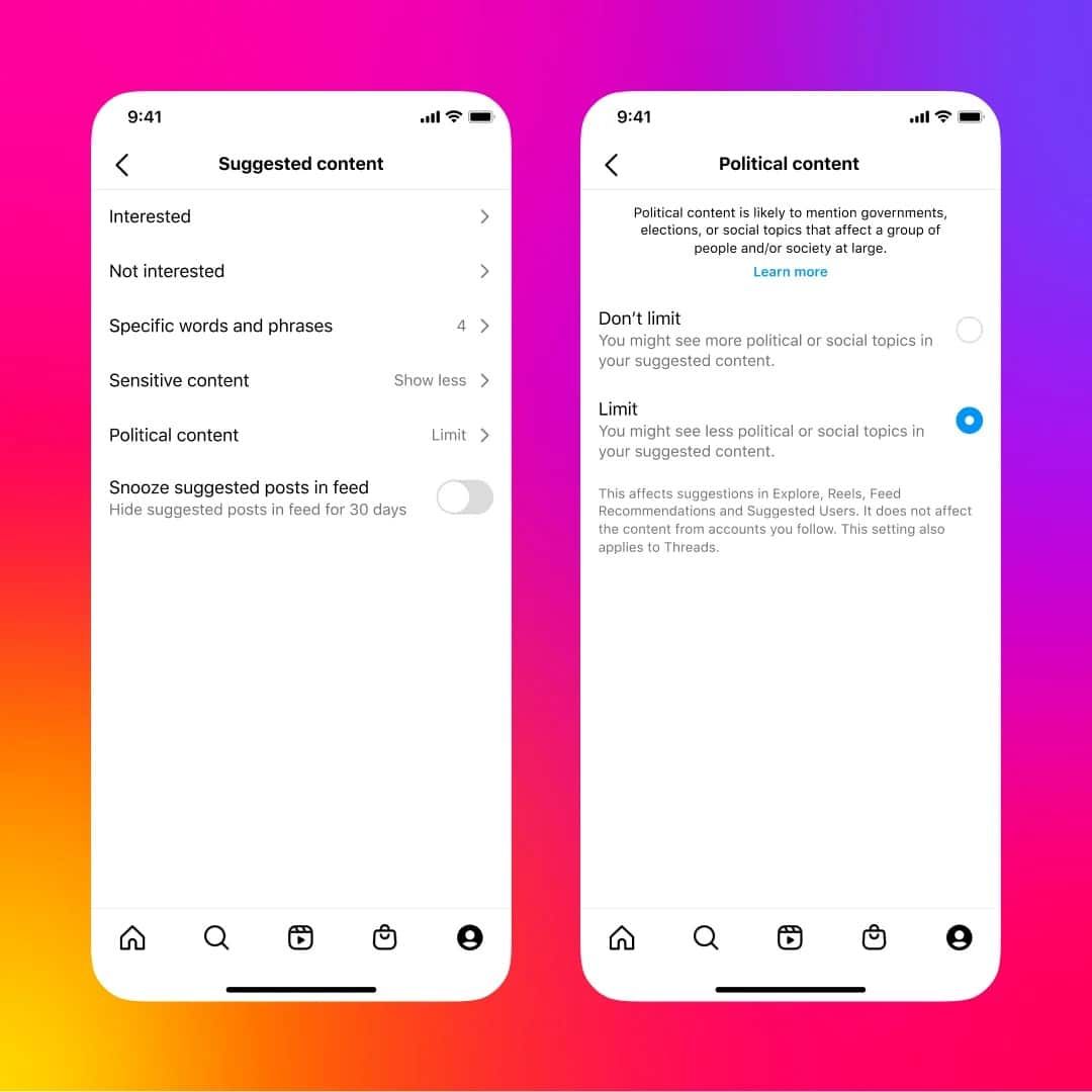 ويمكن للمستخدمين الذين يرغبون في رؤية المزيد من المحتوى المقترح ذي الطابع السياسي في منصتي إنستاجرام وثردز التوجه إلى إعدادات التحكم في إنستاجرام، ثم الذهاب إلى قسم “المحتوى المقترح” Suggested Content، حيث توفر الشركة خياراً جديداً يخص “المحتوى السياسي” Political Content.