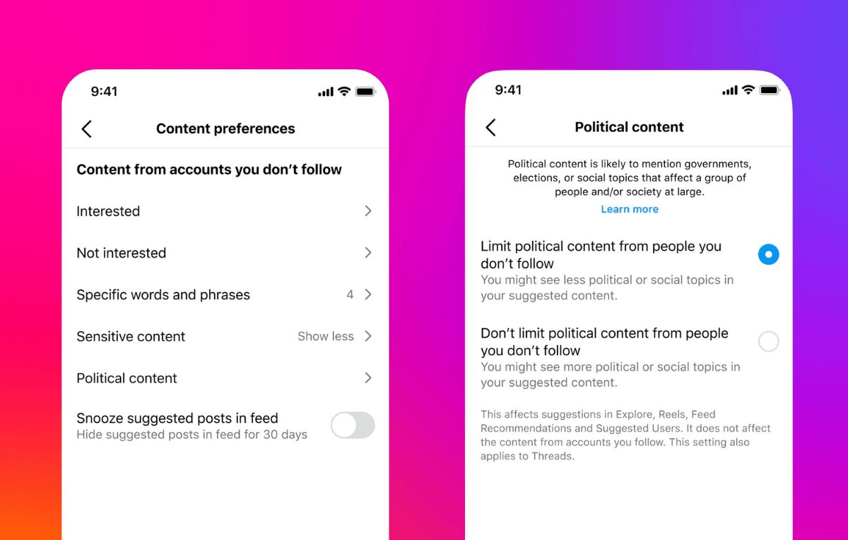 أضافت ميتا خيارًا جديدًا يحد من توصيات المحتوى السياسي ضمن إنستاجرام وثردز، ويأتي ذلك بعد أن أكد المسؤولون التنفيذيون في الشركة منذ مدة أنهم لا يريدون تعزيز المنشورات المتعلقة بالسياسة في التطبيقات.