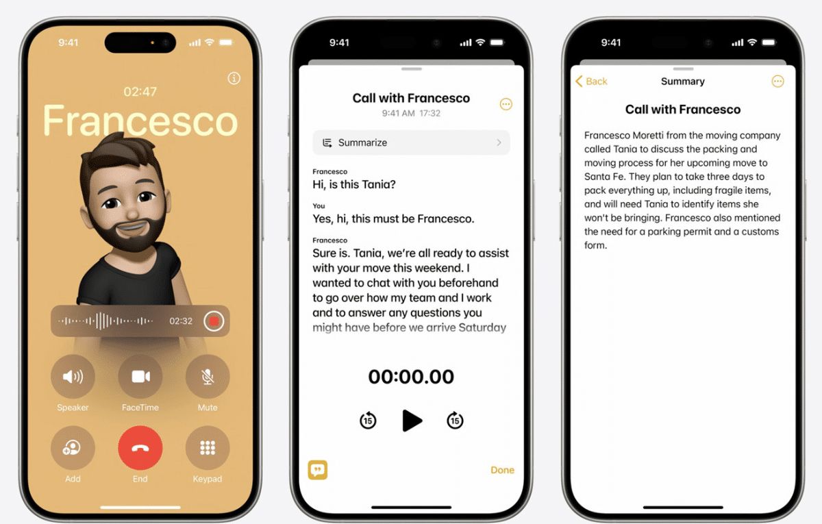 وأثناء تسجيل المكالمة، يستطيع آيفون تقديم نص مكتوب للمكالمة. ويمكن لمزايا Apple Intelligence توليد ملخص للنقاط الرئيسية المضمنة في المكالمة، حتى تتمكن من إلقاء نظرة على ما هو مهم.