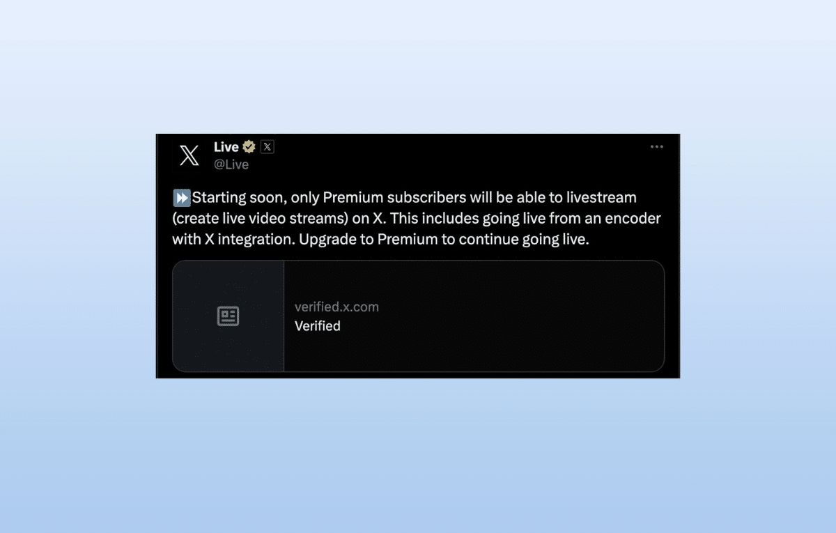 أعلنت إكس أنها تستعد قريبًا لنقل القدرة على البث المباشر ووضعها خلف نظام الاشتراك المدفوع.