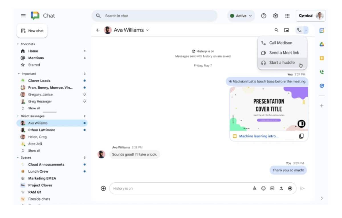 أعلنت جوجل إطلاق ميزة جديدة في خدمة المراسلة والعمل التعاوني “جوجل شات Google Chat” تُعرف باسم “Huddles“، وهي تتيح للمستخدمين إجراء اجتماعات صوتية سريعة وبسيطة.