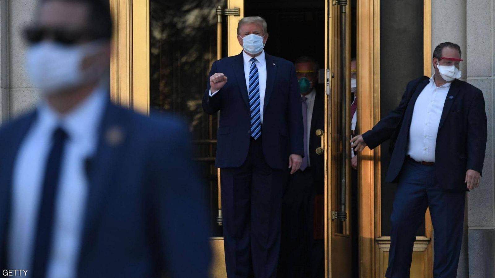 وخرج ترمب من بوابة المستشفى العسكري في بيتيسدا بضاحية واشنطن العاصمة، واضعاً كمامة ومرتدياً بزة رسمية بربطة عنق مقلّمة، وسار بضع خطوات رافعاً إبهامه علامة على النصر ثم استقلّ سيارة سوداء أقلّته إلى طوافة “مارين وان” الرئاسية التي ما لبثت أن أقلعت به متّجهة إلى البيت الأبيض.