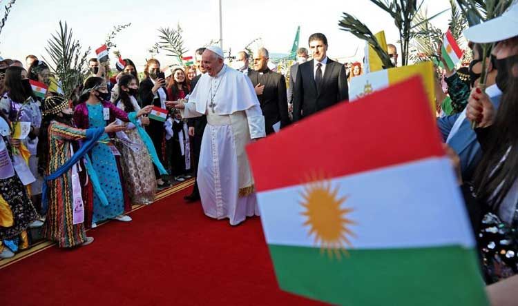 وصل البابا فرنسيس الى أربيل، اليوم الأحد، وسيكون إقليم كردستان العراق المحطة الأخيرة، في زيارته إلى بلاد الرافدين. وكان في مقدمة مستقبليه، رئيس إقليم كردستان العراق نيجيرفان بارزاني، وعدد كبير من المسؤولين الحكوميين، وممثلي القوى السياسية والدينية والاجتماعية، ومن مختلف المكونات في كردستان العراق. وأطلقت فرقة من السريان تراتيب مرحّبة بقدوم البابا باللغة الرسيانية على أرض المطار، رافعين غصن الزيتون الذي يحمل دلالة مسيحية.