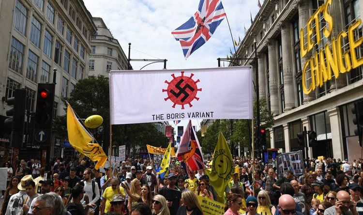 تظاهر الآلاف، السبت، في وسط لندن احتجاجًا على قيود مكافحة كوفيد في بريطانيا، بعد تأجيل رفع آخرها إلى تموز بسبب زيادة الحالات.
