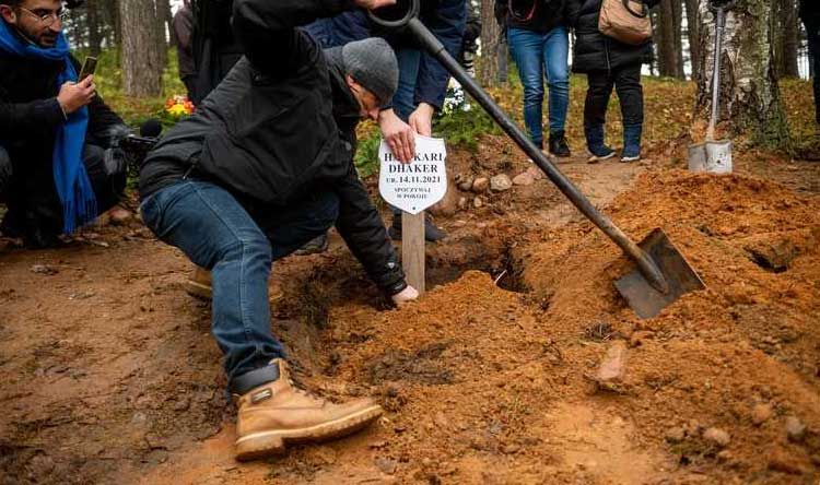 دُفن في مقبرة إسلامية، اليوم الثلاثاء، جنين عمره 27 أسبوعاً، هو ابن مهاجرة عراقية ولدته ميتاً، بعد عبورها الحدود من بيلاروسيا إلى بولندا.