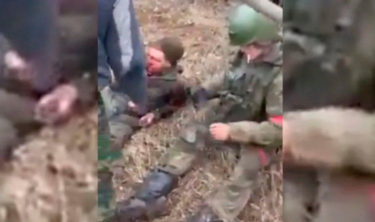ويظهر في الفيديو أسيران من القوات الروسية، وحولهما عدد من الجنود الأوكرانيين ومواطنين.