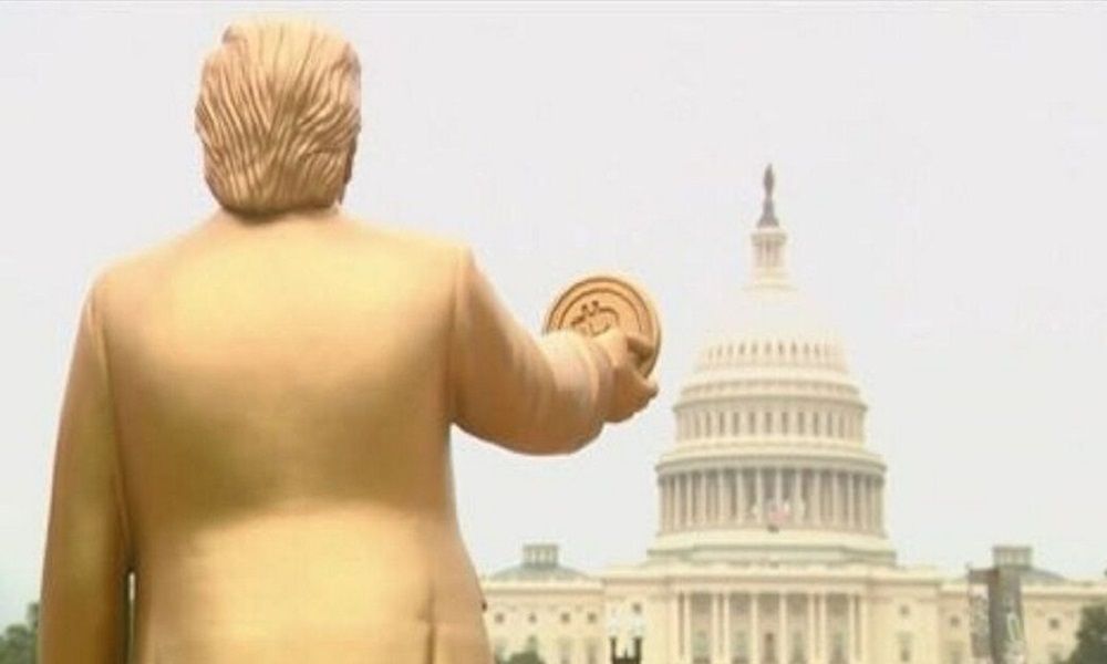 إنتصب تمثال ضخم للرئيس الأميركي دونالد ترامب، أمام مبنى الكابيتول، وهو يحمل نموذجا للعملة الرقمية “بيتكوين” في إشارة للترابط بين السياسة والابتكارات المالية.