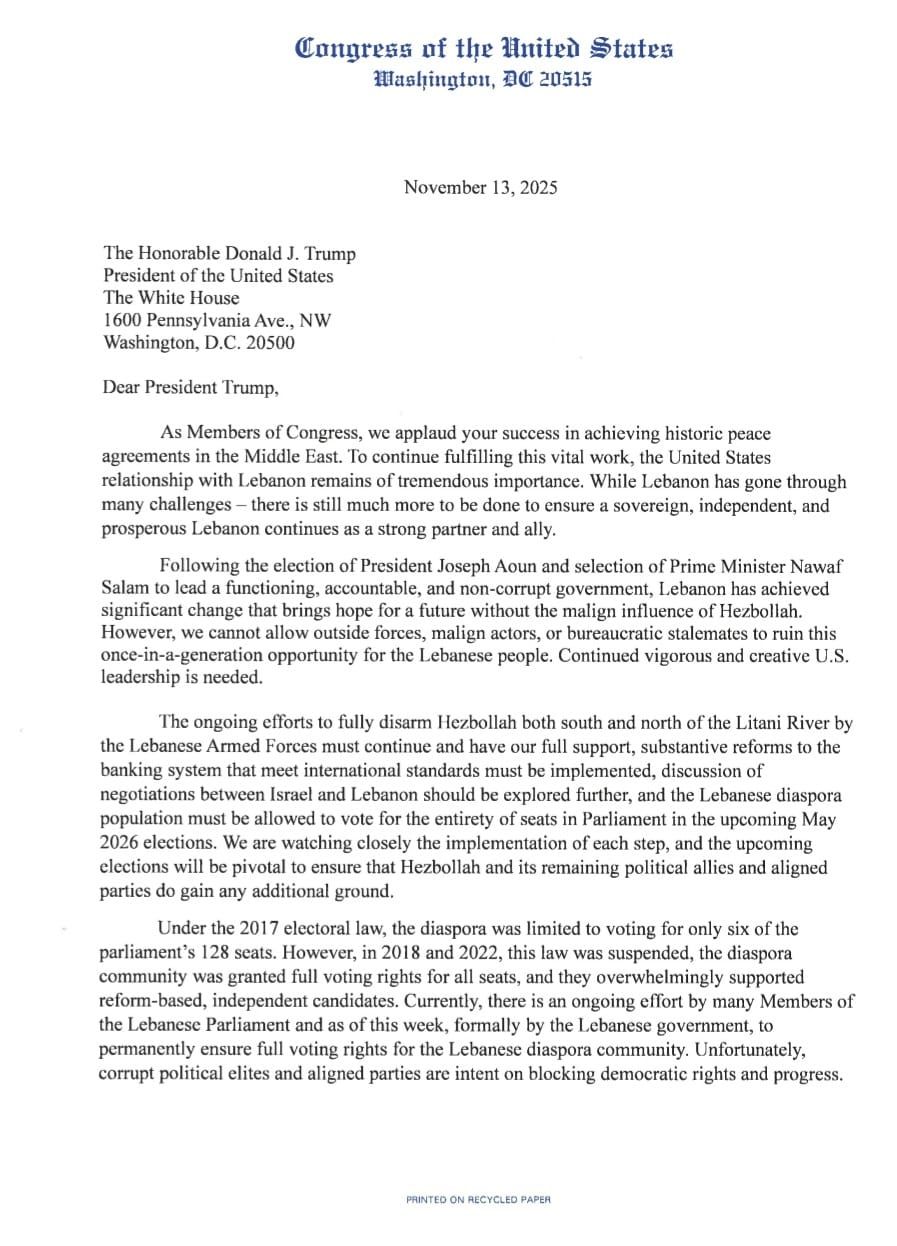 بصفتنا أعضاء في الكونغرس، نُثني على نجاحكم في تحقيق اتفاقيات سلام تاريخية في الشرق الأوسط. ومن أجل الاستمرار في إنجاز هذا العمل الحيوي، يظلّ موقف الولايات المتحدة تجاه لبنان ذا أهمية كبيرة. وعلى الرغم من أن لبنان مرّ بالعديد من التحديات، إلا أن هناك الكثير مما يجب القيام به لضمان استمرار لبنان سياديًا ومستقلًا ومزدهرًا كشريك وحليف قوي.